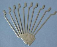 喷气织机用双层筘的筘片分为上下两层,上层为异形筘片,下层为折形筘片,上下层间隔为1.5mm,两层筘隙间距为节距的1/2;同样的筘隙可减少经纱与筘片的摩擦,并能织造较厚的巾被织物,其效率是普通织机的2倍;更重要的是能提高巾被织物质量。双层喷气筘的筘身强度、筘面弹性、筘齿均匀性、筘面平整度、耐磨性等性能指标要求都很高。